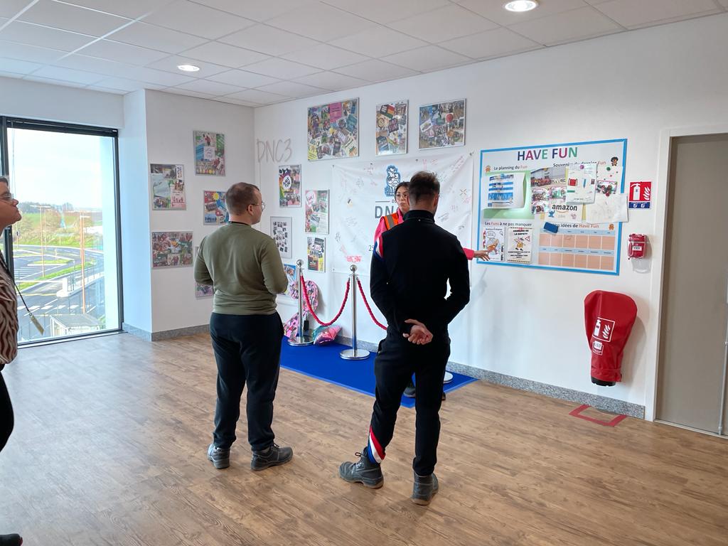Omar, responsable des opérations, et sa collègue Léa ont été nos guides durant la visite. Ils nous accueillent avec de délicieuses viennoiseries, des jus de fruits et des goodies, ce qui plonge tout de suite les jeunes dans une bonne ambiance. Léa met l’accent sur l’importance pour les employés d’Amazon de se sentir bien au travail. Les jeunes découvrent les espaces de pause aménagés avec une cuisine, des décorations festives, et bien sûr, de l’incontournable babyfoot !