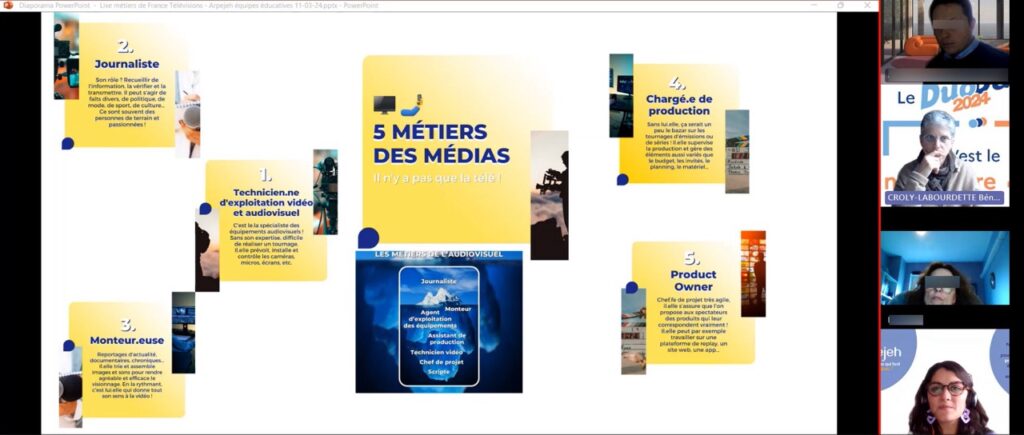 Le 15 novembre dernier, arpejeh et France Télévisions ont organisé une rencontre virtuelle d’une heure destinée aux professionnels accompagnant les jeunes en situation de handicap. Intitulée « Accueil d’équipes éducatives », cette initiative avait pour but de sensibiliser et d’informer sur les possibilités offertes par France Télévisions pour favoriser l’inclusion professionnelle, et d’ouvrir le dialogue.