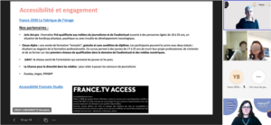 Le 11 mars 2024, arpejeh a coordonné une action en partenariat avec France Télévisions : l’accueil d’équipes éducatives. Cet événement, qui s’inscrit dans une volonté commune de favoriser l’égalité des chances et le vivre-ensemble, a réuni une dizaine de participants connectés autour de Bénédicte, cheffe de projet diversité au sein de France Télévisions. Au cœur des échanges : la présentation de l’entreprise audiovisuelle publique, mais surtout de sa politique active en faveur de la diversité, de l’inclusion et du handicap.