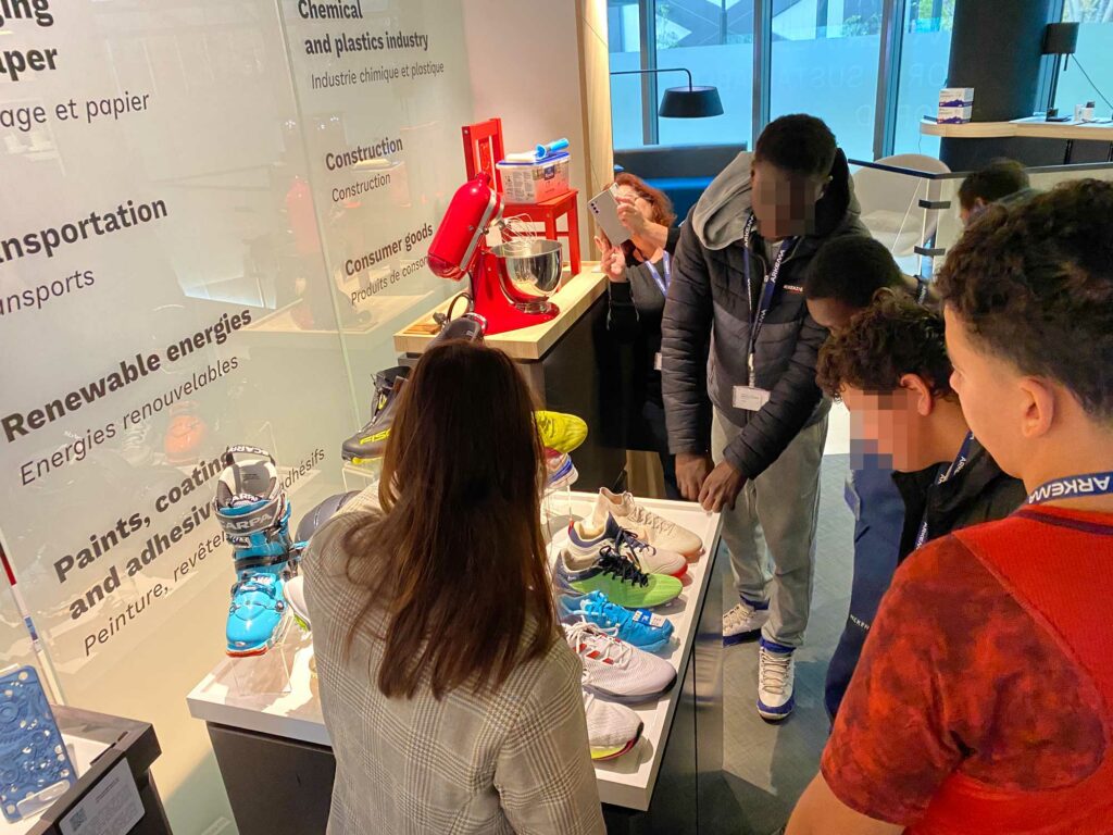 Le groupe a ensuite exploré les différents modules de l’atelier. Ils ont découvert les secrets de la filtration d’eau, des résines, de la fabrication de semelles de baskets, et même des composants utilisés dans les voitures. Un fait particulièrement impressionnant a retenu leur attention : « Grâce à la technologie Arkema présente dans ces chaussures, la personne qui les porte peut gagner 5min sur une course ! » Cette révélation a suscité des regards étonnés et admiratifs parmi les élèves.