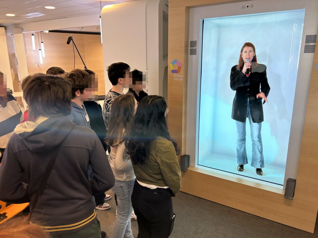 Juste en face, une surprise attend nos jeunes visiteurs. Christel, qui s’est absentée du groupe discrètement, réapparait subitement en direct… dans un écran translucide, grâce à une projection holographique. Elle est présente, avec nous, à taille réelle, avec une impression de 3D, alors qu’elle est, en fait, dans une autre pièce. « Vous utilisez un fond vert ? » demande l’une des collégiennes, manifestement très informée. « Même pas ! en revanche, cette technologie un peu magique se transmet par 5G… Là aussi, nous y travaillons avec des partenaires », lui explique-t-on.
