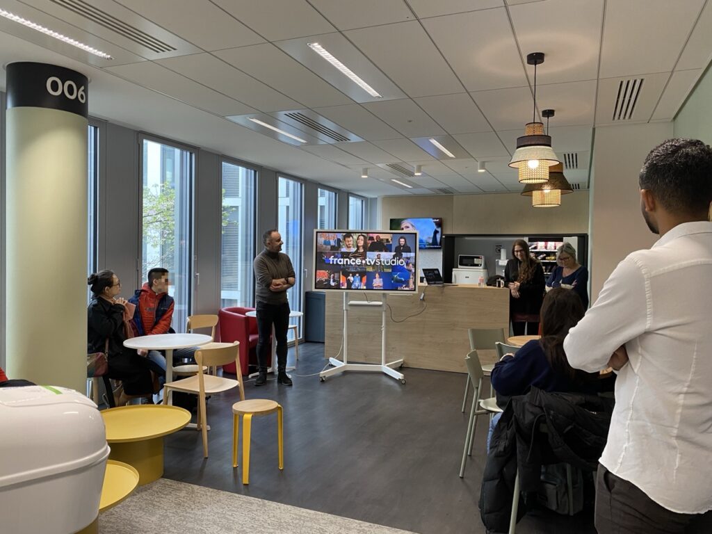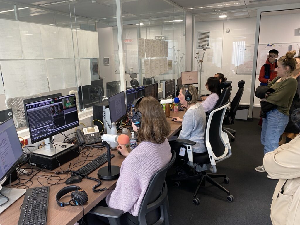 Le groupe a eu l’opportunité d’assister à une séance de sous-titrage en direct, un moment particulièrement impressionnant. Ce travail d’équipe mobilise quatre professionnels : un rédacteur vocal, son aide, un correcteur et son assistant. Chacun a un rôle bien défini pour garantir un résultat fluide et compréhensible en temps réel.
