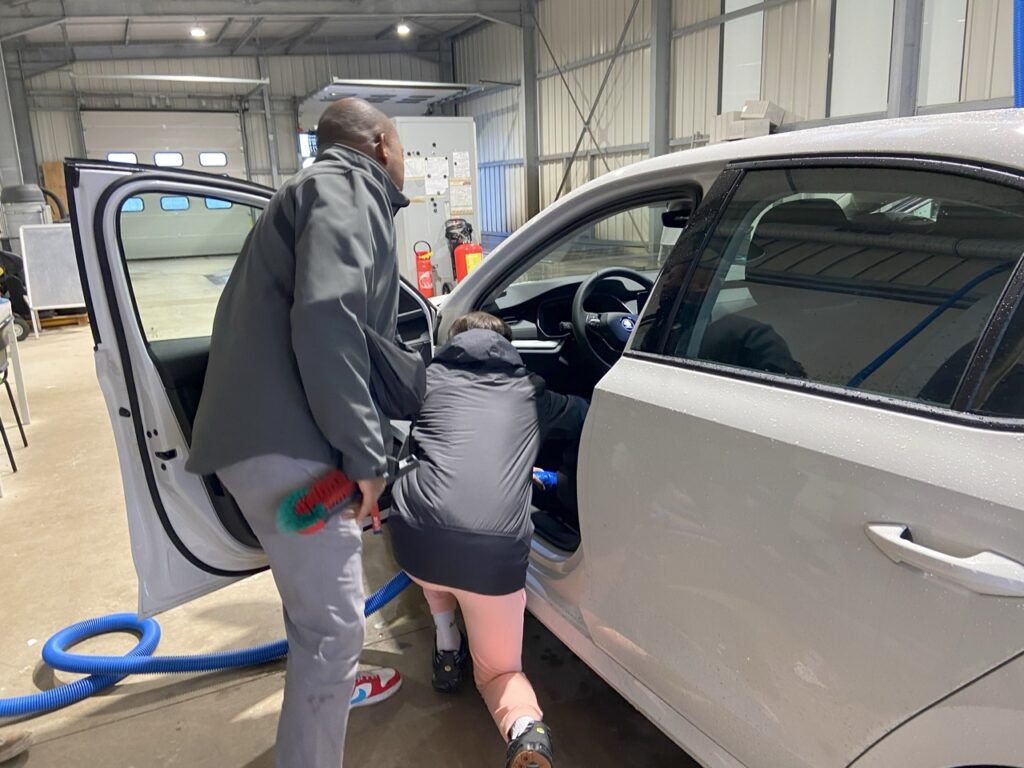 Par la suite, le groupe s’est rendu à l’atelier pour explorer le métier de préparateur de véhicules. Edouard et Cynthia ont proposé aux jeunes de participer activement en aidant un préparateur à nettoyer un véhicule et à effectuer le checking des niveaux. Cette expérience immersive leur a permis de mieux appréhender les exigences du métier. Alain, le préparateur présent, a répondu à toutes leurs questions sur les horaires, les salaires et la charge de travail quotidienne. Edouard a souligné qu’aucun diplôme n’est requis pour ce poste, la motivation étant le principal critère de recrutement. Il a également précisé que des opportunités d’évolution professionnelle existent au sein de l’entreprise, illustrées par l’exemple d’une gestionnaire de parc ayant débuté en tant que préparatrice.