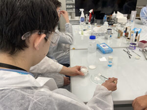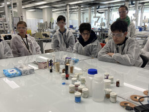 Guidés par Valérie et Céline, les jeunes ont eu l’opportunité de découvrir les différentes étapes de fabrication des produits et de manipuler des matières premières telles que le beurre de karité et l’huile de coco. Ils ont également participé à des expériences pratiques, telles que la démonstration de l’utilisation des tensio-actifs pour lier des substances non miscibles.