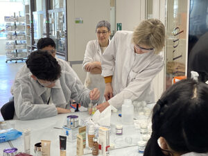 Guidés par Valérie et Céline, les jeunes ont eu l’opportunité de découvrir les différentes étapes de fabrication des produits et de manipuler des matières premières telles que le beurre de karité et l’huile de coco. Ils ont également participé à des expériences pratiques, telles que la démonstration de l’utilisation des tensio-actifs pour lier des substances non miscibles.