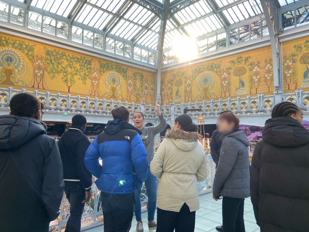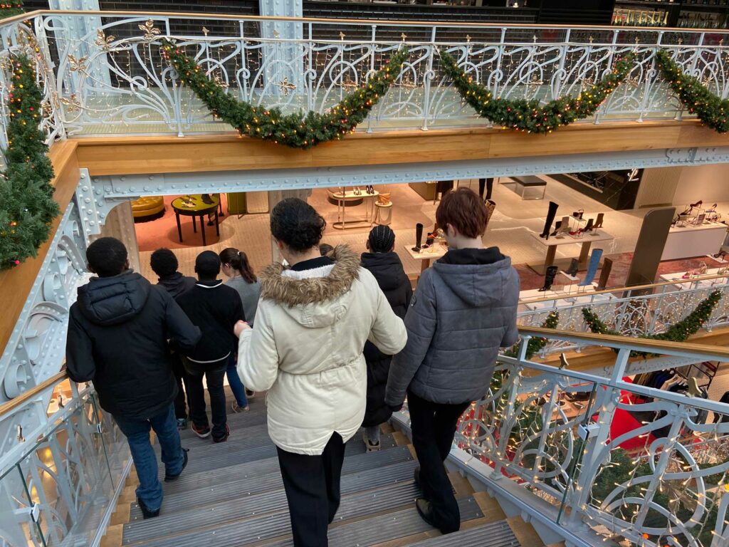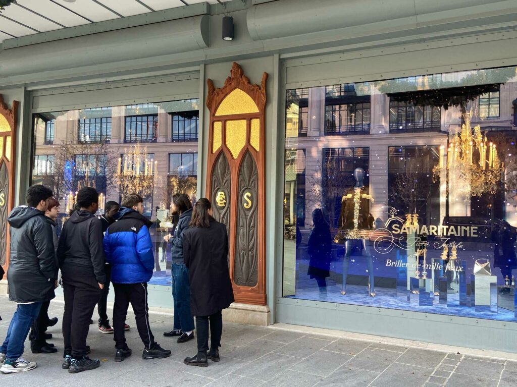 Le mercredi 22 novembre, c’était au tour de neuf jeunes du lycée des métiers d’Epinay-sur-Seine de visiter La Samaritaine. Accompagnés de Mehdi et Margot, ils ont débuté par une présentation extérieure de l’architecture historique du bâtiment, bravant le froid hivernal.