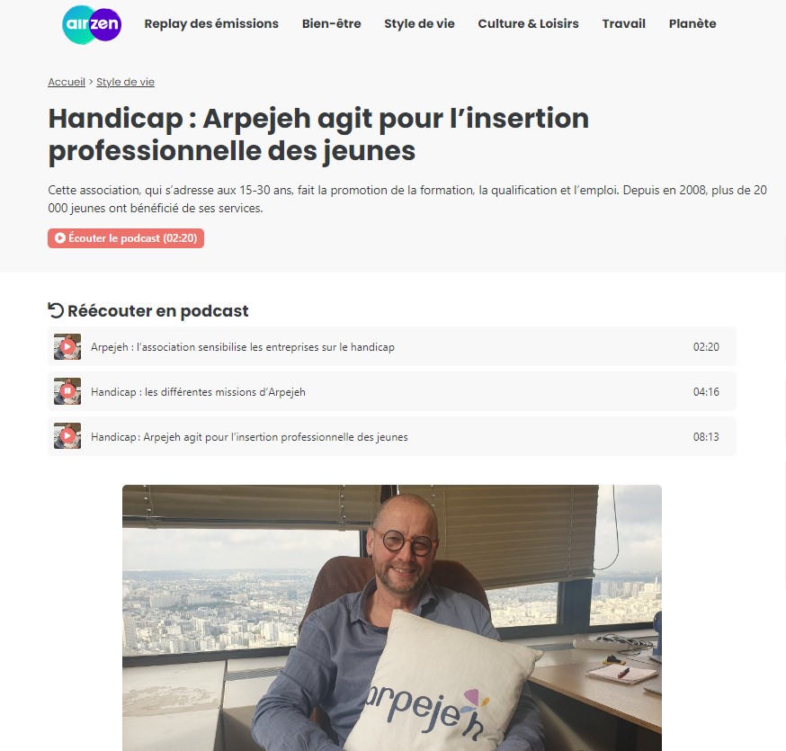 Pour la radio AirZen, la journaliste Jennifer Biabatantou est venue à la rencontre de Yannick Kusy, porte-parole de l’association arpejeh, dans nos bureaux, tour Montparnasse, pour mieux comprendre comment notre équipe agit pour l’insertion professionnelle des jeunes en situation de handicap, entre autres.