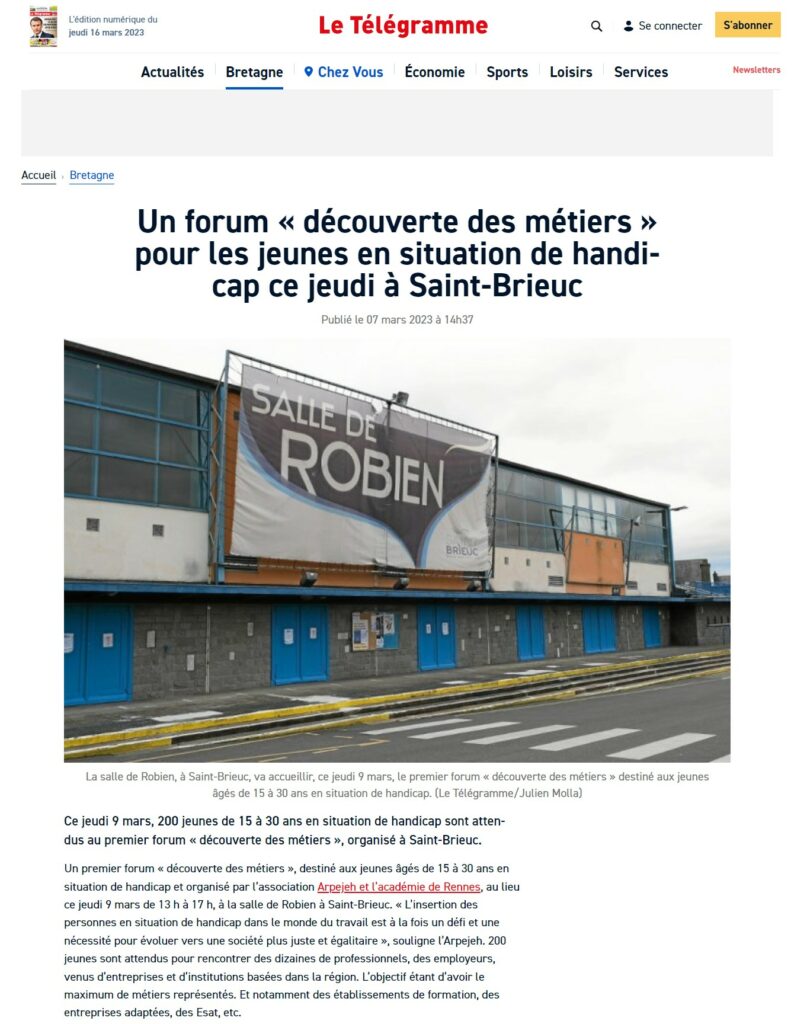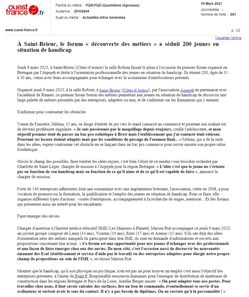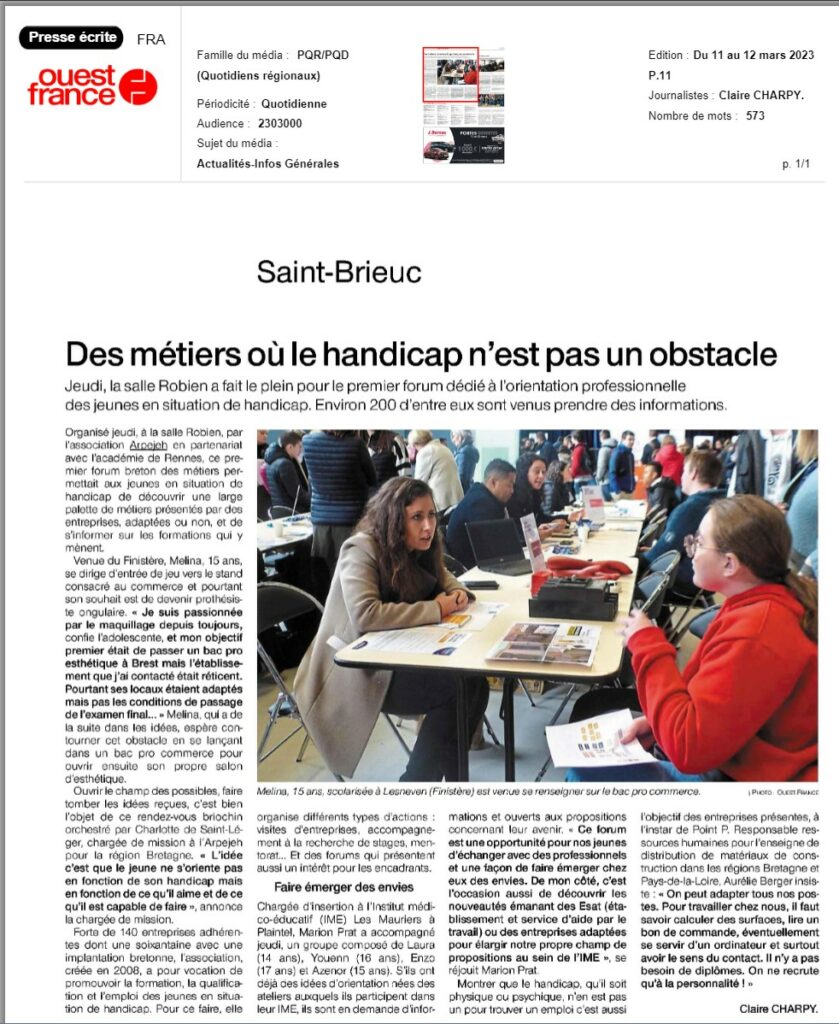 Revue de presse : Ouest-France et le Télégramme racontent le Forum "Découverte des métiers" de Saint-Brieuc - arpejeh