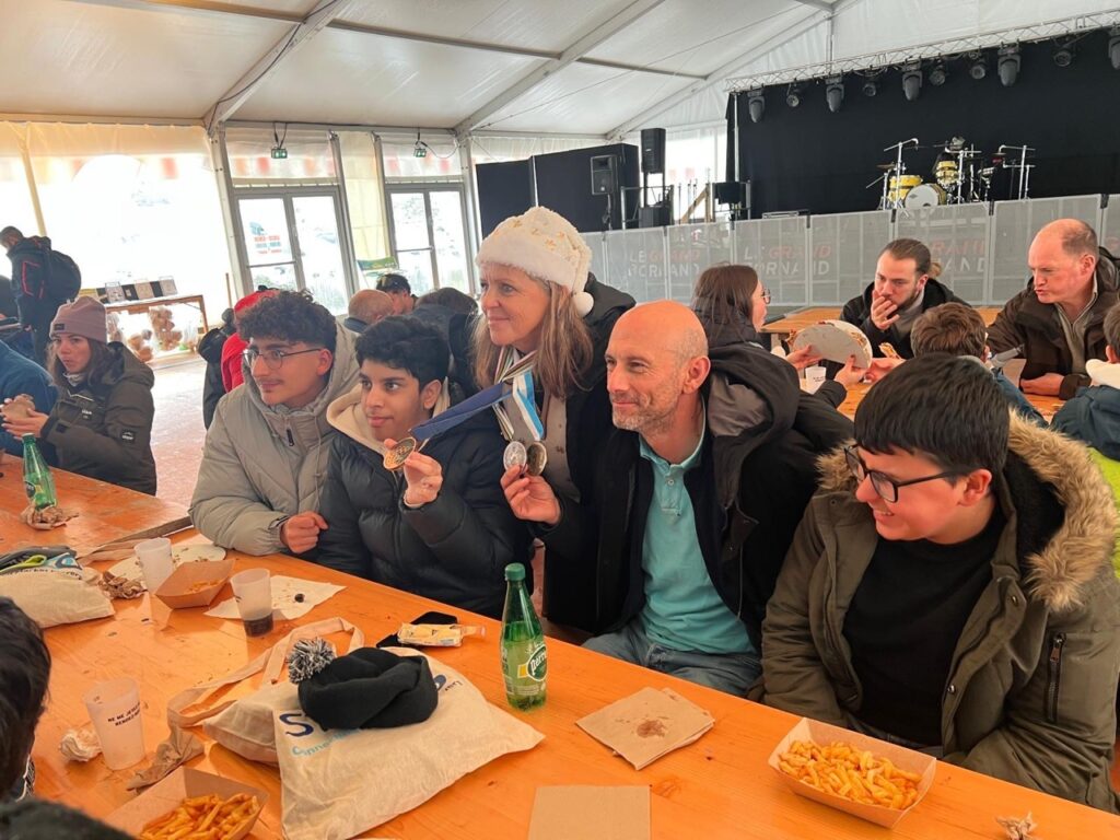 Dès leur arrivée, les élèves ont eu l’immense privilège d’être accueillis par Delphine Burlet, ancienne athlète de haut niveau et médaillée olympique. Ce moment unique a été l’occasion pour les jeunes de poser des questions, d’apprendre sur le quotidien d’une championne, et même d’admirer de près les médailles qu’elle a remportées au cours de sa carrière. Cette interaction a non seulement inspiré les jeunes, mais a également renforcé leur confiance en eux, en leur montrant que les rêves peuvent devenir réalité. Le déjeuner, partagé dans une ambiance conviviale, fut un beau moment de partage et de joie. Installés non loin des supporters qui animaient l’événement avec leur musique, les élèves ont pu échanger sur leurs impressions et leurs attentes pour l’après-midi.