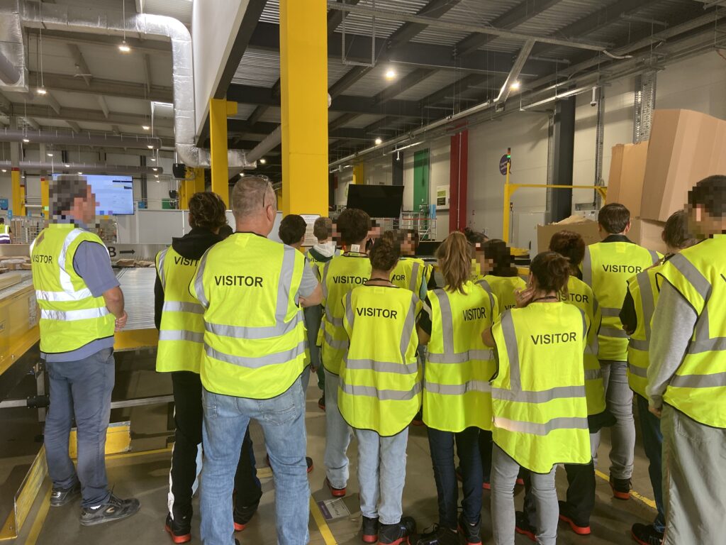 Dylan, un salarié de l’entreprise, a pris en charge le groupe pour leur faire découvrir le parcours d’un colis au sein de l’entrepôt. Ils ont commencé par observer le déchargement d’un camion rempli de colis divers. Ensuite, ils ont pu voir les colis arrivant en induction, où Dylan leur a expliqué le processus de scan avec des appareils mécaniques.