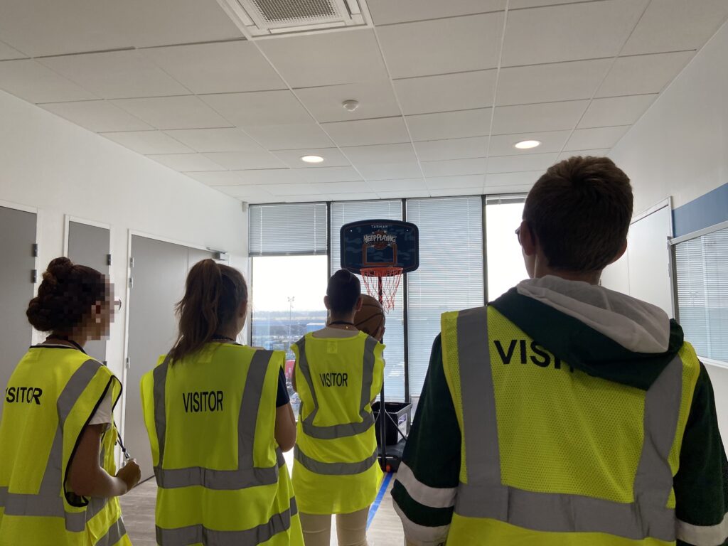 Après cette première partie de la visite en entrepôt, le groupe a découvert la salle de pause, équipée de baby-foot, de paniers de basket et d’autres espaces de détente pour les salariés. Ce moment a permis aux jeunes de voir l’importance du bien-être au travail.