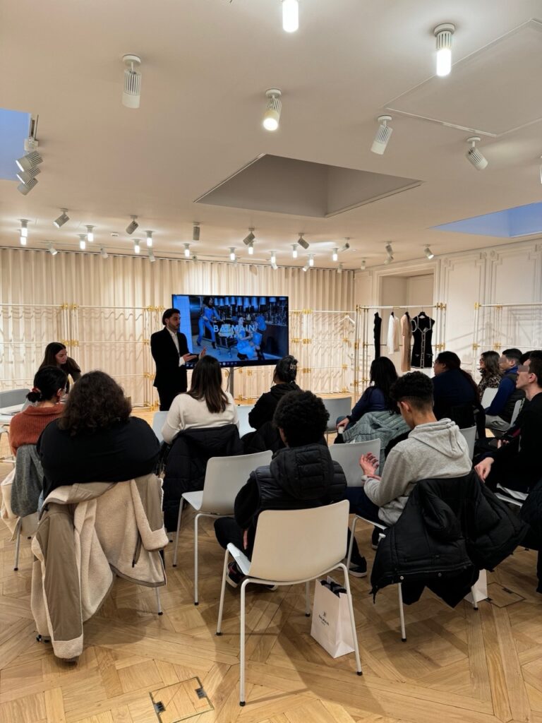 Dès leur arrivée, les jeunes visiteurs ont été chaleureusement accueillis par les collaborateurs de BALMAIN. La maison, fondée en 1945 par le couturier Pierre Balmain, est aujourd’hui une référence incontournable du luxe français, connue pour son style audacieux et raffiné. À travers cette visite, l’objectif était de leur faire découvrir les métiers de la vente et l’environnement unique d’une enseigne de renom.