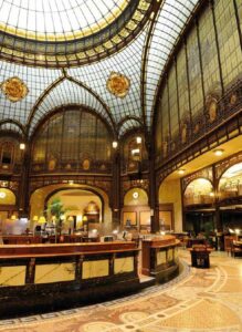 Farid, historien du Groupe, rattachée à la Direction de la Communication, nous a guidés avec passion à travers les couloirs chargés d’histoire de la Société Générale. Fondée en 1864, elle est la plus ancienne banque française à avoir conservé son nom d’origine et son indépendance juridique. Nous avons appris que la banque possède une coupole à pinacle intérieure, culminant à 28 mètres de haut, offrant une luminosité unique sur le guichet circulaire. Deux films ont même été tournés dans ces locaux emblématiques : « La Banquière » avec Romy Schneider et « Peur sur la Ville » avec Jean-Paul Belmondo.